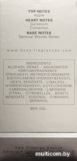 | Информация | Мужчина в стиле Boss ориентирован на успех, целеустремлен и созидателен. Мужественность, достоинство, уверенность - его главные черты, наряду с чувственностью и романтичностью. Он любит комфорт, красивые вещи, роскошную жизнь и выражает себя в классическом покрое дорогих костюмов и истинно мужском аромате, полном благородства и достоинства. Флакон в форме винной бутылки прост и необыкновенно притягателен. Он словно передает, что важно внутреннее содержание, а не внешнее убранство и лоск. Верхние ноты: яблоко, цитрусовые фрукты.Ноты сердца: корица, герань, гвоздика. Ноты шлейфа: сандаловое дерево, кедр, оливковое дерево. |