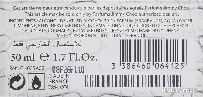 | Информация | Jimmy Choo Man заявлен как парфюм для элегантных и уверенных в себе мужчин с острым чувством стиля.Jimmy Choo Man - современный и свежий аромат, соединяющий в себе ароматические, фруктовые и древесные ноты. Он включает аккорды медовой дыни, розового перца, листьев ананаса, лаванды, пачули и замши. |