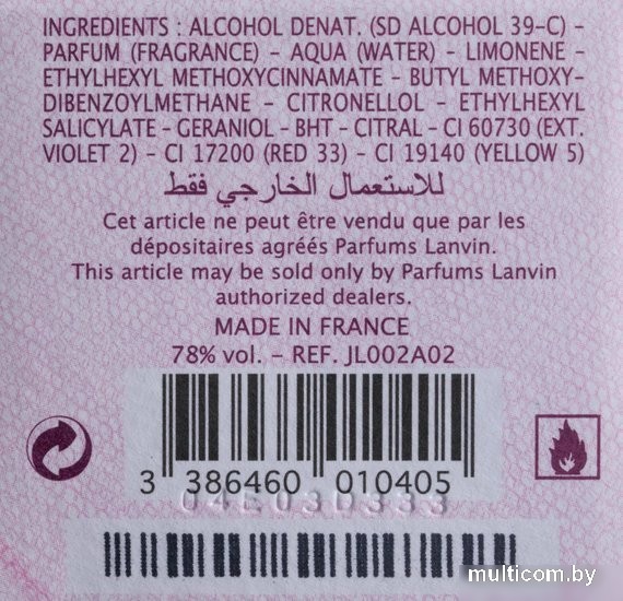| Информация | Аромат назван в честь основательницы модного бренда Жанны Ланвин, а флакон украшает логотип, созданный дизайнерами Lanvin еще в 1920-е годы. Не смотря на ретро-стиль оформления, парфюм предназначен для молодых и веселых девушек. Букет аромата одновременно простой и изысканный, немного отражающий эпоху Жанны Ланвин своими цветочными нотами белой фрезии и пиона. |