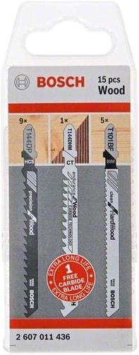 | Комплектация | Набор пилок по дереву:- 9 пилок T144DP Precision for WoodОбщая длина: 100 ммШаг зубьев: 4 мм- 5 пилок T101BF Clean for Hard WoodОбщая длина: 100 ммШаг зубьев: 2,7 мм- 1 пилка T144DHM Endurance for WoodОбщая длина: 100 мм |