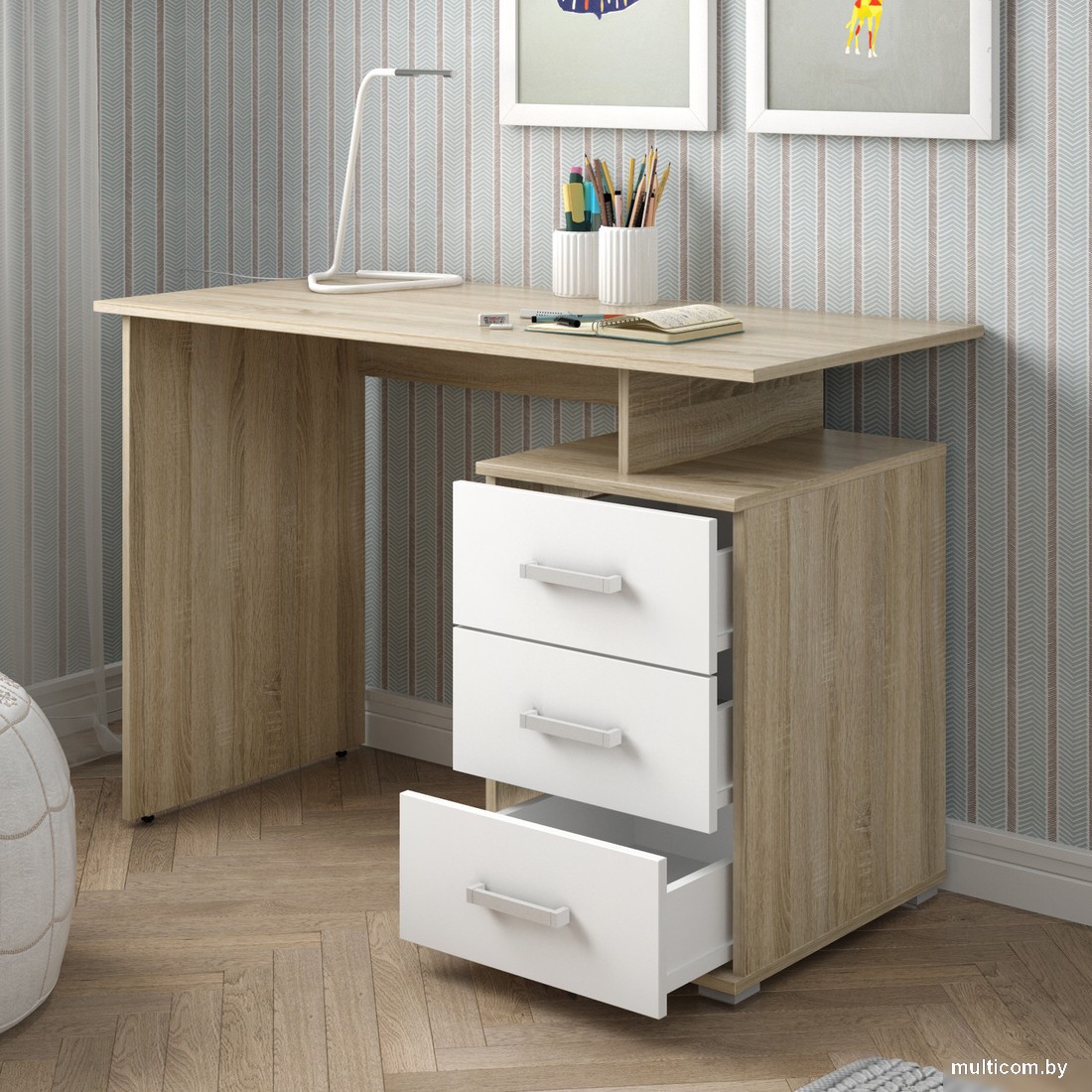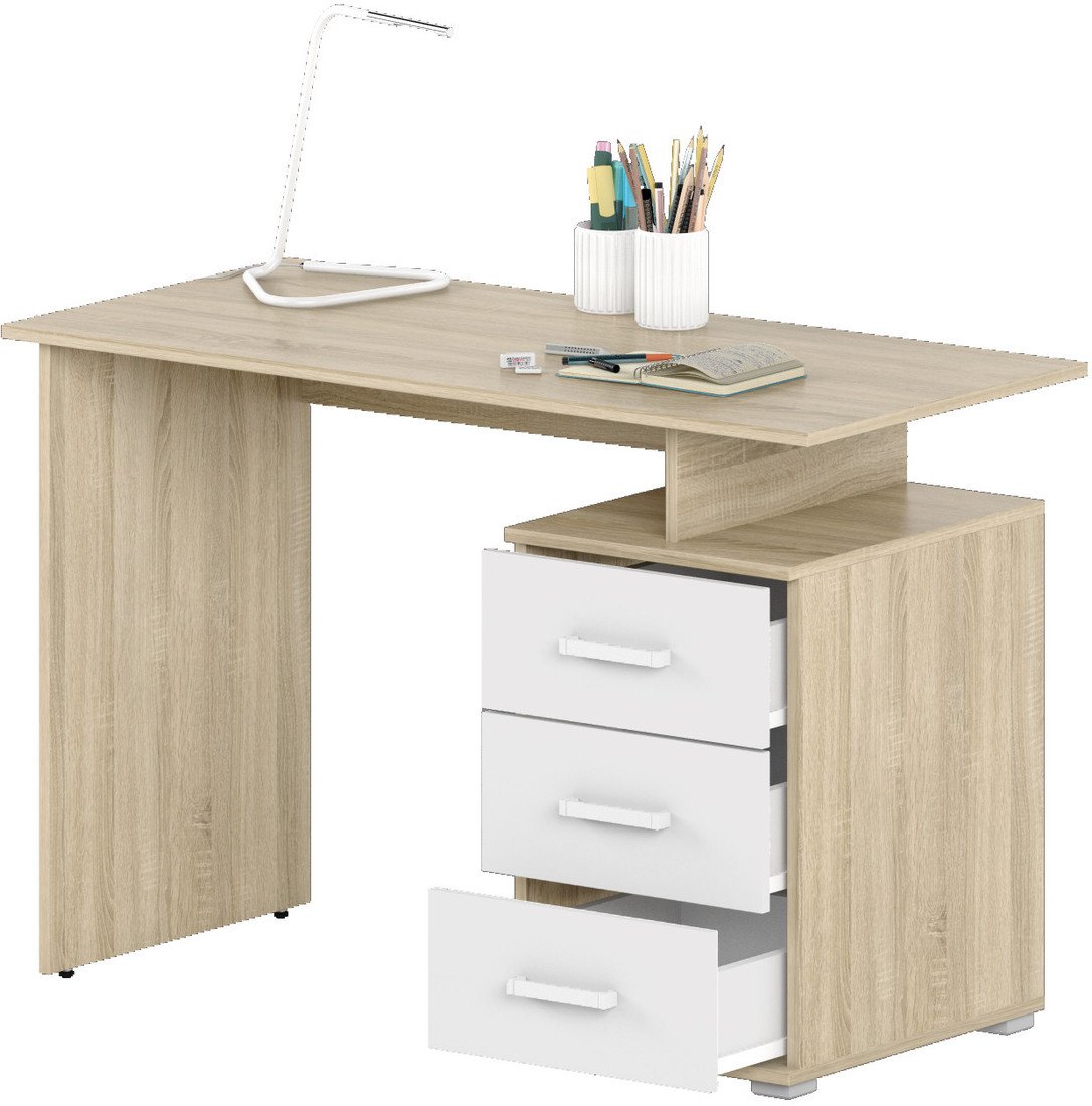 | Информация | - Славянская столица Д-СП1 - письменный стол с одним местом. - Ширина стола составляет 55 см, а высота - 75 см. - Стол имеет правостороннее исполнение, прямоугольную форму столешницы и толщину столешницы 18 мм. - Материал столешницы и опор - ЛДСП. - Тумба с тремя ящиками входит в комплект. - Стол поставляется в разобранном виде. - Полки открытые. - Принадлежит к коллекции Д (Славянская столица). - Длина стола составляет 115 см. |