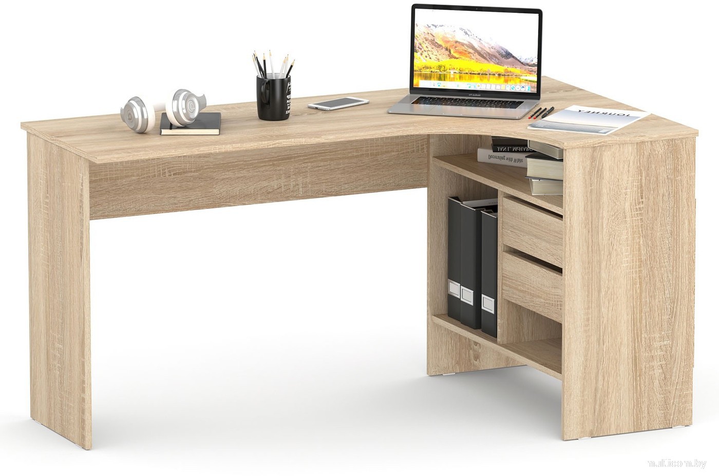 | Информация | - Угловой письменный стол идеально подходит для обустройства рабочего места в домашнем кабинете или офисе. - На широкой столешнице есть место для монитора, клавиатуры или ноутбука, а также другой техники. - В выдвижных ящиках и открытых отделениях удобно хранить книги и канцелярию. - Конструкция предусматривает нишу под системный блок. |