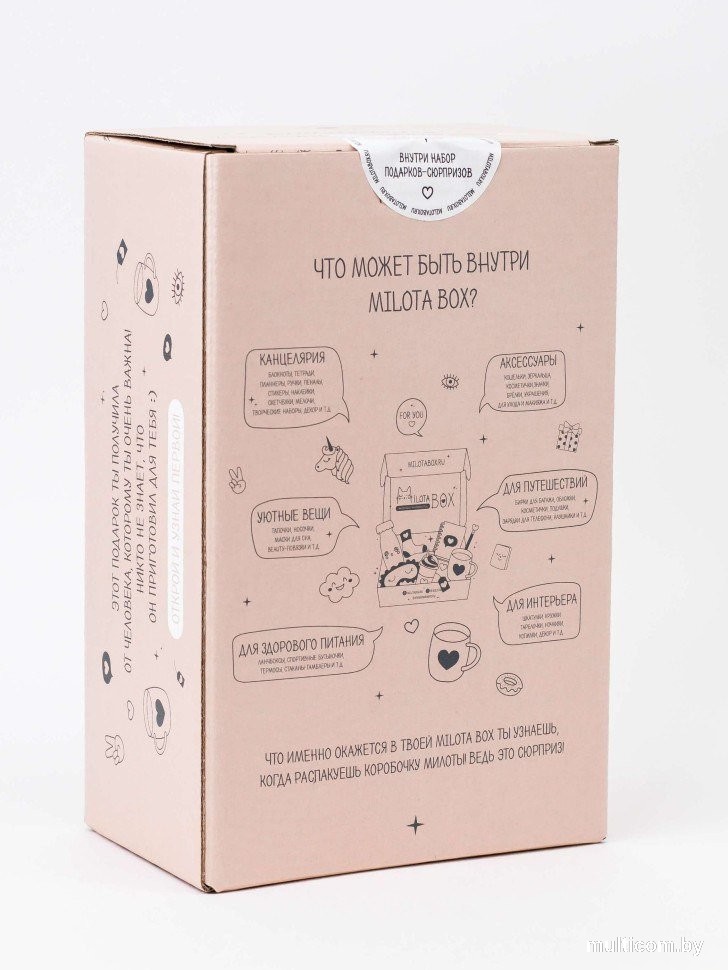 | Информация | - Каждая коробочка наполнена уникальными предметами, которые сделают вашу повседневную жизнь более приятной. Здесь вы найдете милую канцелярскую продукцию, уютные товары для дома, стильные аксессуары и вещи для здорового образа жизни. |