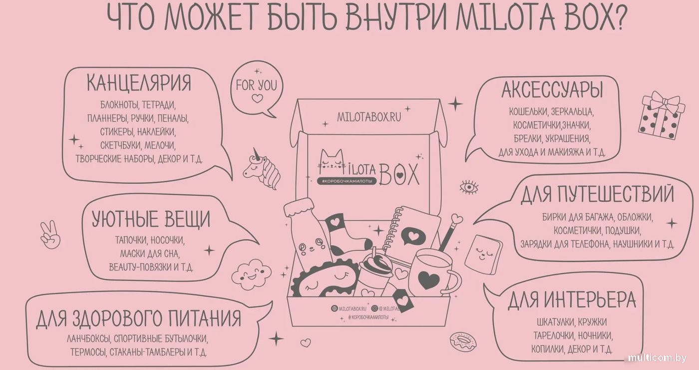 | Информация | - Каждая коробочка наполнена уникальными предметами, которые сделают вашу повседневную жизнь более приятной. Здесь вы найдете милую канцелярскую продукцию, уютные товары для дома, стильные аксессуары и вещи для здорового образа жизни. |