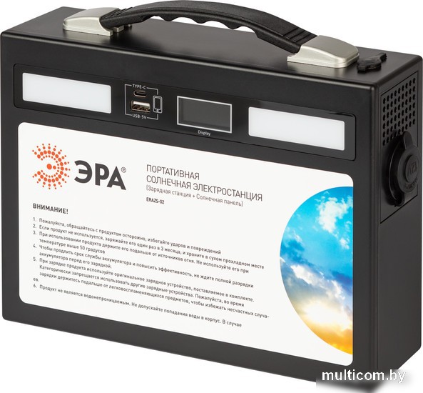 | Информация | ?ERAZS-02 ЭРА Портативная солнечная электростанция, 400 Вт, 54 000 мАч, Li-ion. Солнечная панель 50 Вт ?Эта портативная солнечная электростанция обеспечит вас энергией в любом месте и в любое время. ?Солнечная панель мощностью 50 Вт позволяет быстро заряжать электростанцию даже при недостаточном освещении. ?С большой емкостью батареи 54 000 мАч вы сможете использовать эту электростанцию для зарядки различных устройств многократно. ??400 Вт мощности обеспечат надежное питание для различных электроприборов. |
