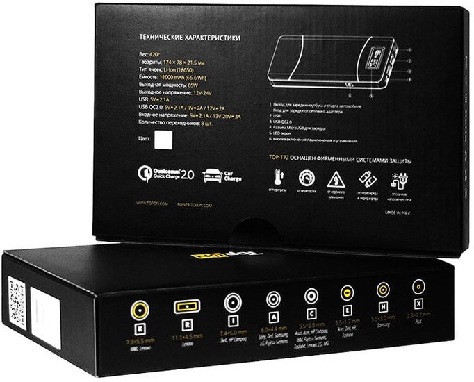| Информация | Выходное напряжение:OUT1: QC2.0 5V~2.1A, 9V~2A, 12V~2A;OUT2: 5V 2.1ADC OUT: 12V-13V~3A, 18V–19.5V~3A, 18V–19.5V~3A, 20V–22V~3A, 24V–26V~2AВходное напряжение:microUSB: 5V~2.1ADC IN: 13V-20V~3A |