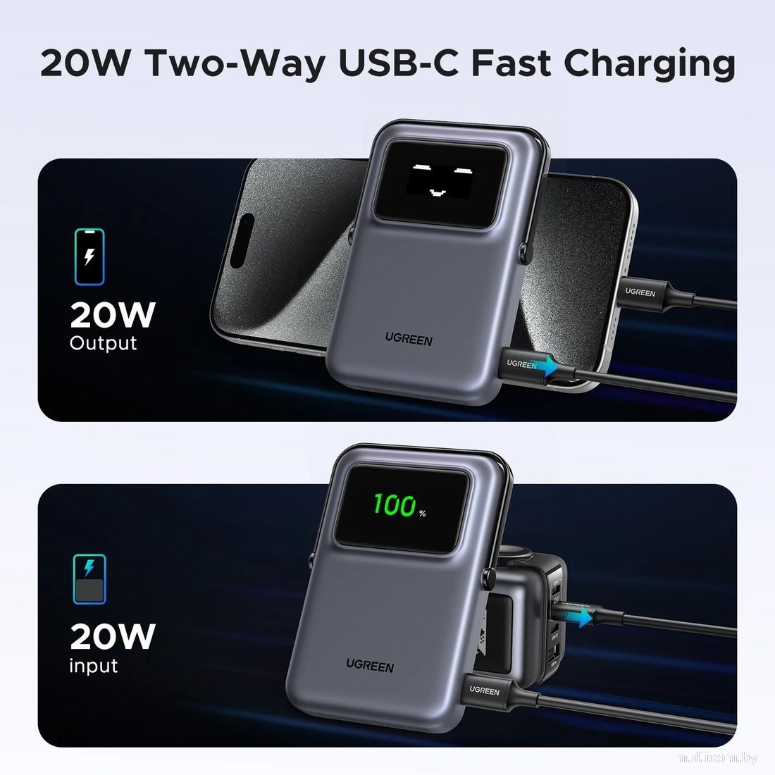 | Информация | - UGREEN Power Bank с ёмкостью 10000 мА·ч сочетает в себе компактность и высокую производительность. Он легко помещается в карман или сумку, оставаясь незаменимым помощником в поездках и на каждый день. Одной зарядки достаточно, чтобы восполнить энергию большинства смартфонов и планшетов один-два раза. - Уникальный дизайн в стиле футуристичного робота придаёт устройству индивидуальность. Благодаря мягкому силиконовому покрытию внешний корпус устойчив к ударам, а откидная подставка позволяет удобно разместить телефон в процессе зарядки. - Цветной TFT-дисплей делает контроль за уровнем заряда простым и приятным. Он отображает состояние аккумулятора с помощью забавных анимаций, добавляя нотку игривости в повседневное использование. - Устройство поддерживает как беспроводную зарядку мощностью 7,5 Вт, так и быструю проводную зарядку по стандарту PD 20 Вт. Это позволяет одновременно заряжать два устройства, не жертвуя скоростью и удобством. - Благодаря сильному магнитному креплению (с усилием до 10 Н), power bank идеально подходит для iPhone серий 12–15, включая iPhone 15 Pro Max. Дополнительный USB-порт делает его универсальным решением для зарядки любых других устройств. |