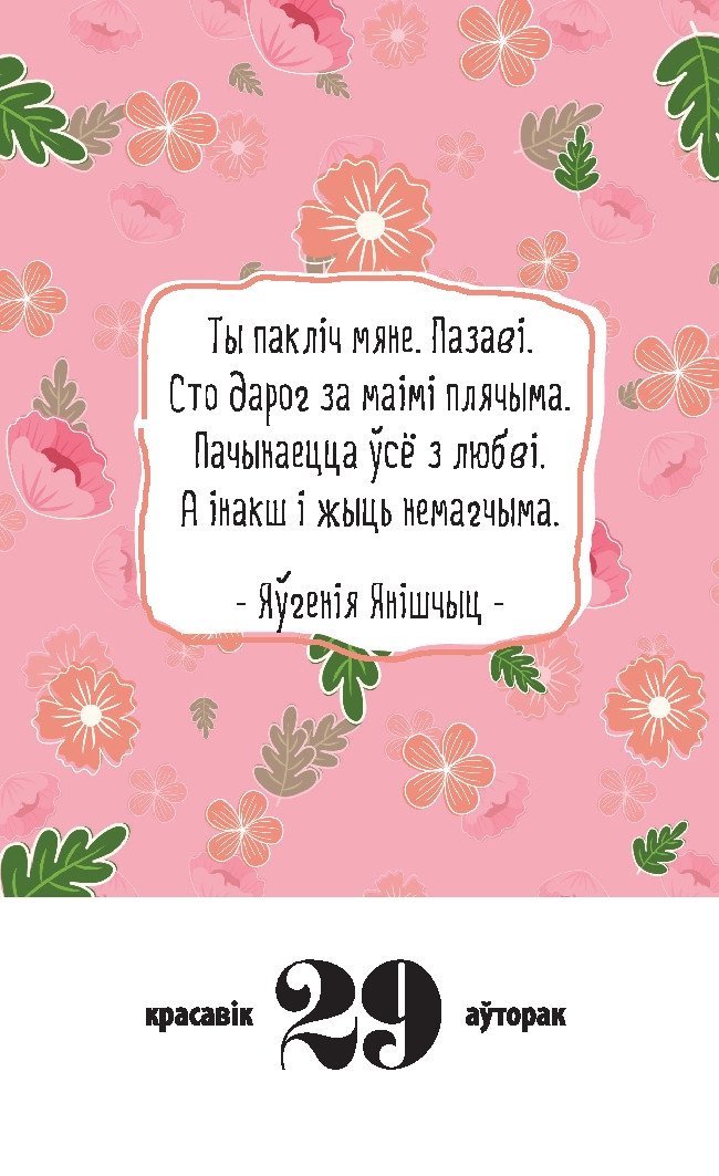 | Информация | Гэты настольны адрыўны каляндар на беларускай мове складаецца з 365 цікавостак: вершы, жарты, прымаўкі, матывацыйныя цытаты і афарызмы, якія суправаджаюцца моднымі выявамі. Каляндар не зойме шмат месца на вашым стале, але адразу ж створыць утульную атмасферу. Ён укладзены ў кардонную скрынку, якая замяняе падарункавую ўпакоўку і абараняе ад пашкоджанняў. Ніводная старонка не загнецца ў часе дастаўкі ці перасылкі падарунка. Вечка лёгка трансфармуецца ў падстаўку, трымаецца з дапамогай унутраных магнітаў і не патрабуе дадатковых прыстасаванняў. Старонкі календара надзейна трымаюцца на металічным крапяжы і адрываюцца яшчэ лягчэй дзякуючы перфарацыі. |