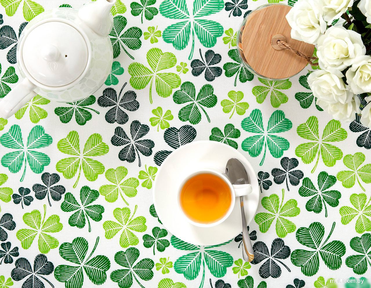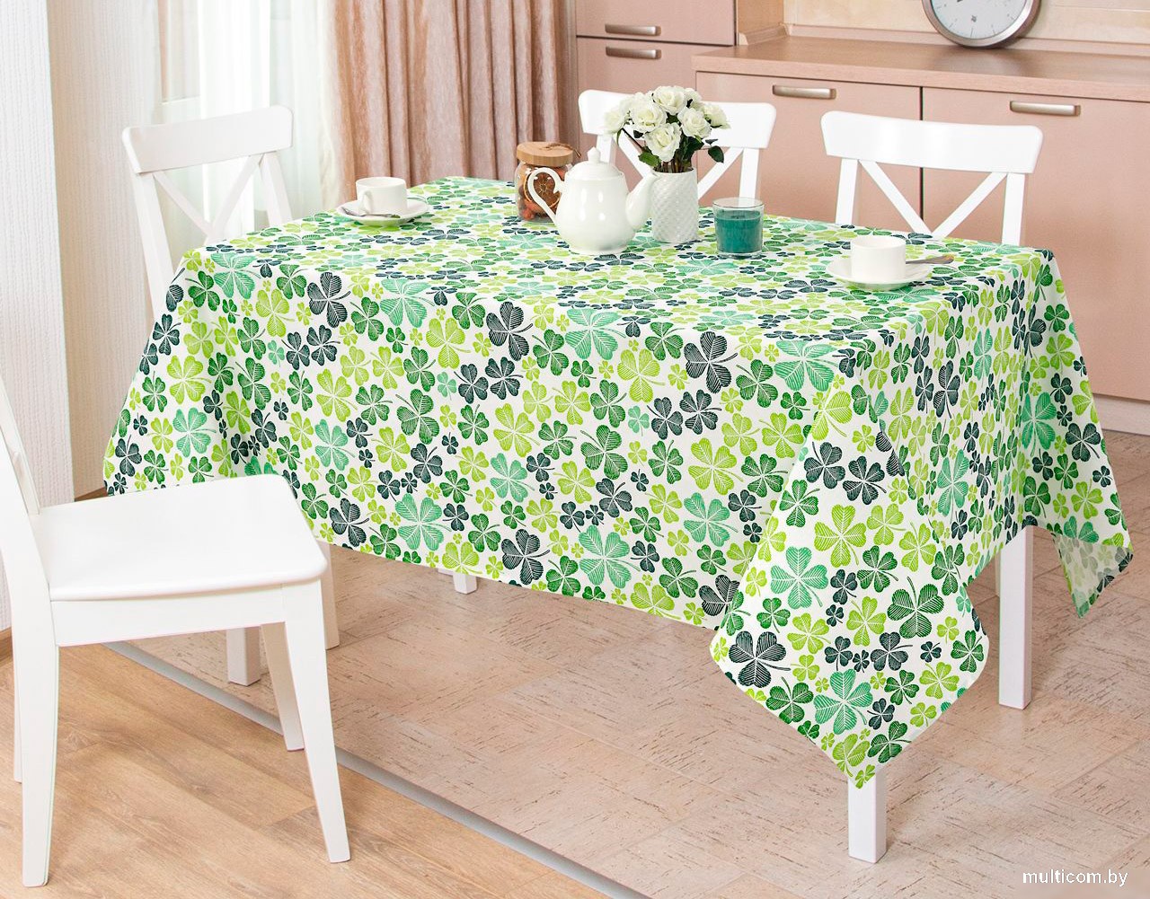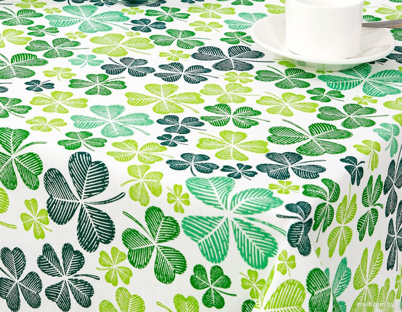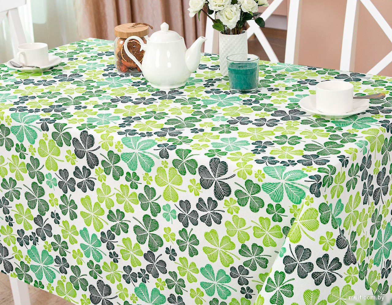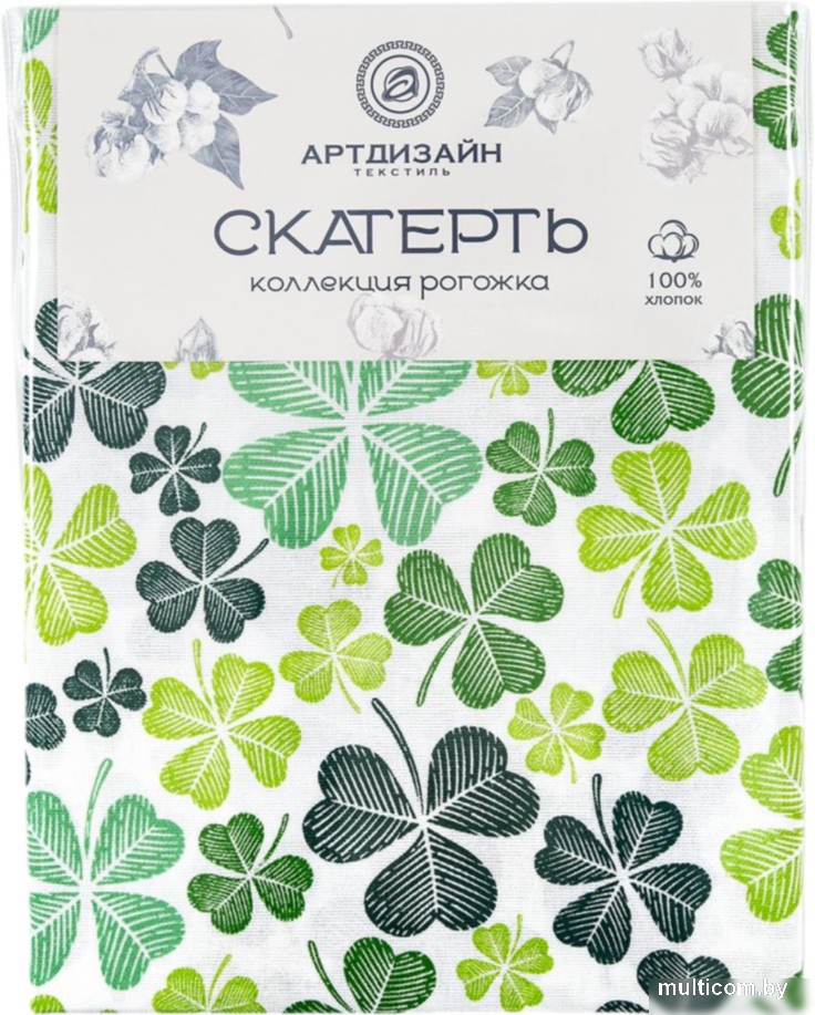 | Информация | - "Клевер" - символ счастья и удачи, модный принт с волшебным цветком, приносящий богатство и благополучие.  - Скатерть рогожка выполнена в светлой цветовой гамме и украшена четырехлистным клевером - символом старых легенд. - Изделия из рогожки в зеленой палитре освежат интерьер дома или дачи и добавят в окружающее пространство весенне-летние нотки. - Оригинальный подарок для каждой хозяйки!  |