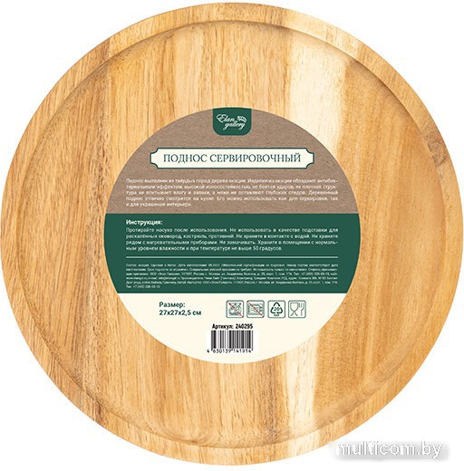 | Информация | ? Поднос Elan Gallery 240295 (акация) идеально подходит для эстетичной подачи на стол различных блюд, от сыра к вину до суши и сладостей. Выполнен из натурального дерева акации, он может использоваться как разделочная доска или декоративная подставка. Размер внутренней емкости 25?25 см. Хранить вертикально или в подвешенном состоянии, вдали от нагревательных приборов при нормальном уровне влажности. Нельзя замачивать или мыть в посудомоечной машине. После мытья протирайте насухо. Этот деревянный поднос станет удобным дополнением кухни или приятным подарком для ваших родных и близких. |