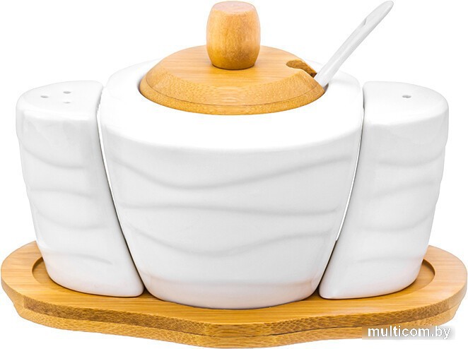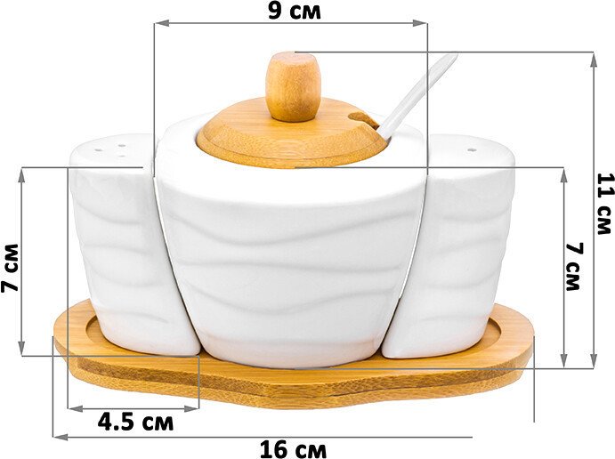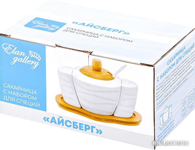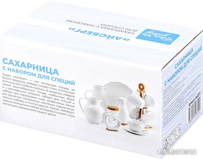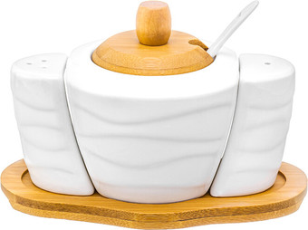 | Информация | Набор серии "Айсберг волны" состоит из сахарницы на 300 мл с фарфоровой ложкой, солонки и перечницы на деревянной подставке. Набор выполнен из высококачественного фарфора и натурального бамбука. Сахарница и емкости для специй украшены рельефными узорами. Емкости для специй снизу имеют отверстия для наполнения, которые закрываются пластиковыми пробками. Размер набора 16х10х11 см. Фарфоровые детали набора можно мыть в посудомоечной машине. Бамбуковые детали нельзя замачивать. Набор поставляется в яркой картонной упаковке. Набор для специй из серии посуды "Айсберг волны" сможет стать настоящим украшением кухни или приятным подарком для ваших родных и близких! |