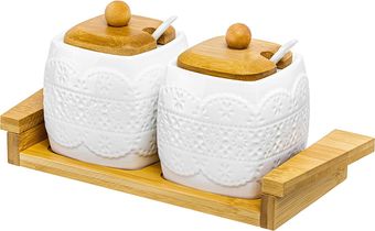 | Информация | Набор из двух сахарниц из серии «Белое кружево» объемом 400 мл каждая с деревянной крышкой, фарфоровой ложкой и деревянной подставкой с ручками выполнен из высококачественного фарфора и натурального бамбука. Теплое цветовое решение, изящный рельефный рисунок на фарфоре и удобство использования делают этот набор желанным подарком любой хозяйке. У сахарниц широкое горло, которое удобно мыть, а бамбуковая крышка не позволит сахару намокнуть. В серии фарфоровой посуды с использованием бамбука представлен широкий ассортимент товаров для сервировки стола, которые несомненно впишутся в любой интерьер благодаря лаконичному дизайну, натуральным материалам и высокой функциональности. Такому подарку будет рада любая хозяйка! |