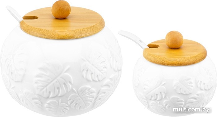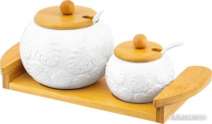 | Информация | ? Набор для специй Elan Gallery Тропики 540675 - это комплект, который включает в себя сахарницу и солонку с ложками, размещенные на деревянной подставке. ? Этот набор идеально подходит для использования с сахаром, солью, медом, вареньем, специями, соусами и другими продуктами. ? Подставка оборудована удобными ручками, что позволяет легко переносить и сервировать набор к столу. ? Изготовленный из высококачественного фарфора и натурального бамбука, этот набор украшен рельефными узорами в виде листьев. ? Фарфоровые детали набора безопасны для использования в микроволновой печи и посудомоечной машине, в то время как бамбуковые детали не подлежат замачиванию. ? Поставляется в стильной картонной упаковке. |