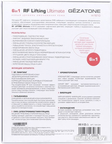 | Комплектация | Аппарат Gezatone m1610 - 1 штЗарядное устройство с базой - 1 штБлок питания - 1 штИнструкция по эксплуатации - 1 шт |