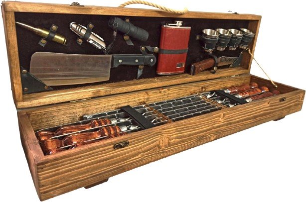 | Состав набора | чехол для хранения (чемодан), нож (классический, мультитул, топорик), шампур (6 шт.), мангал (складной), стопка (4 шт.), зажигалка (пуля), фляжка (240 мл), фонарик |