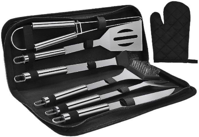 | Состав набора | нож для гриля, вилка для гриля, лопатка для гриля, щипцы для гриля, кисточка для гриля, чехол для хранения (38.5?14 см), щетка для гриля, перчатка (16?17?14 см) |