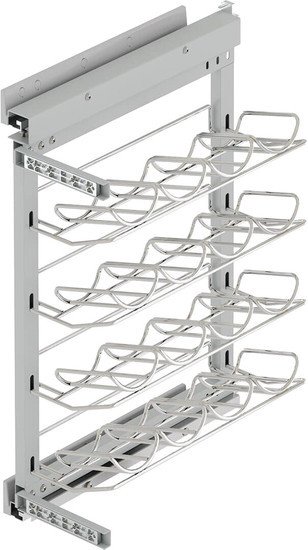 | Информация | Особенности:устанавливается в нижние шкафы кухонного гарнитура; боковое левое/правое крепление; Tandem направляющие полного выдвижения; система Soft Closing, обеспечивающая плавное и тихое закрывание; максимальная нагрузка 30 кг; съемные полки для бутылок; гальваническое покрытие. Комплектация:Tandem направляющие с доводчиком полного выдвижения — 2 шт.; рама — 1 шт.; полка — 4 шт.; фасадное крепление — 2 шт.; крепежная фурнитура. |