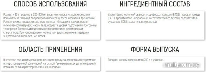 Информация | BINASPORT SUPREME WHEY PROTEIN (Бинаспорт Суприм Вей Протеин) - белковый продукт, состоящий на 100% из изолята сывороточного белка и натуральных вкусовых компонентов, произведенных ведущими европейскими компаниями.Изолят сывороточного белка, входящий в состав BINASPORT SUPREME WHEY PROTEIN (Бинаспорт Суприм Вей Протеин), получен с помощью новейшей технологии мембранной ультрафильтрации напрямую из натурального молока (минуя этап производства сыра). Эта технология мягче традиционной и сывороточные белки получаются менее денатурированными, поэтому в Европе их называют «нативными» сывороточными белками.BINASPORT SUPREME WHEY PROTEIN (Бинаспорт Суприм Вей Протеин) богат разветвленными аминокислотами – BCAA (23 г на 100 г продукта) и глутамином (16,5 г на 100 г продукта). |