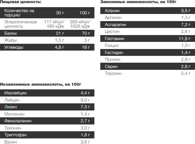 Пищевая ценность (порция) | Количество на порцию - 30 г/100 гЭнергетическая ценность - 117 кКал/ 490 кДж/389 кКал/ 1628 кДжБелки - 21 г/70 гЖиры - 1,5 г/5 гУглеводы - 4,8 г/16 г |