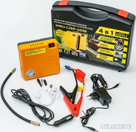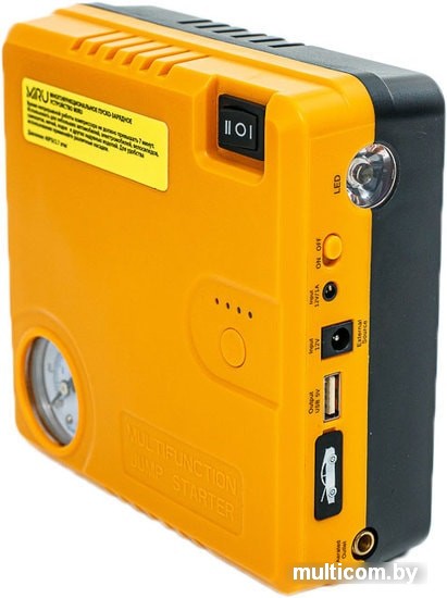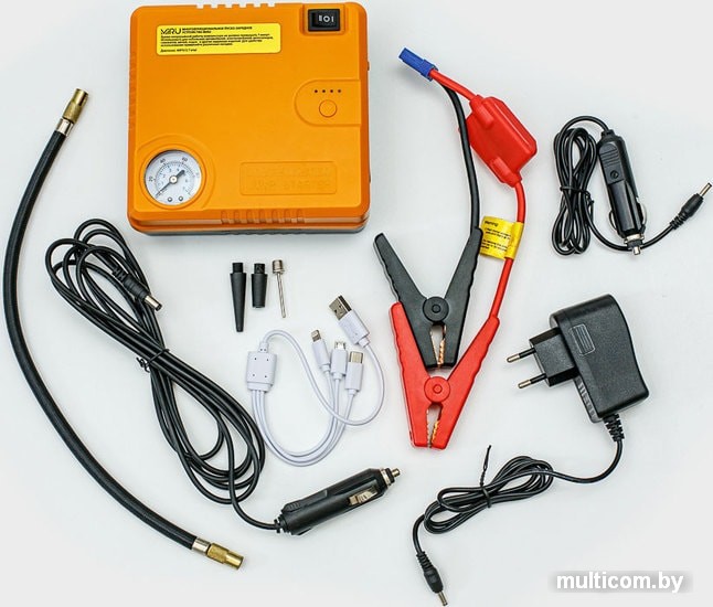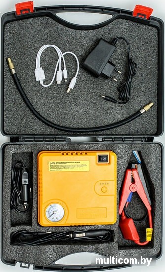 | Информация | Встроенный компрессор с барометромУдлиненный кабель для зарядки от прикуривателяКабель для зарядки смартфоновШланг с насадками для подкачкиЕмкость аккумуляторной батареи: 16800 мАчВыходное напряжение пускового разъема: 12ВВыход USB 5В — 2АРежим зарядки CC/CV 12V—1AНачальный пусковой ток: 200-300АПиковый пусковой ток: 400-600АЦиклы перезарядки: около 1000Температура использования от -20°C до +60°СИндикатор заряда батареи |