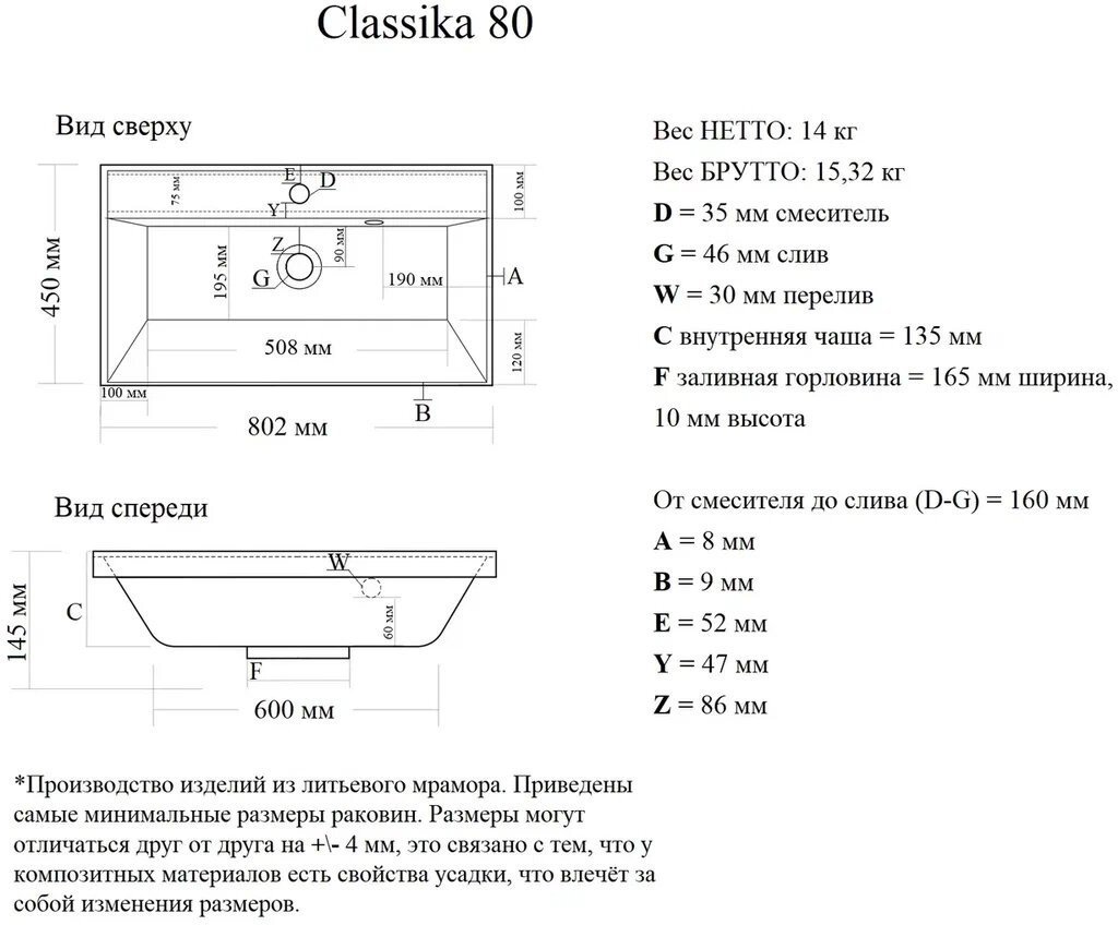 | Информация | - Умывальник Doratiz Classica 80 0302.995 - самая популярная модель в европейском стиле с глубокой чашей, которая защитит от брызг. - Изготовлен из литого мрамора, благодаря чему имеет утонченные формы и идеальную белизну. |