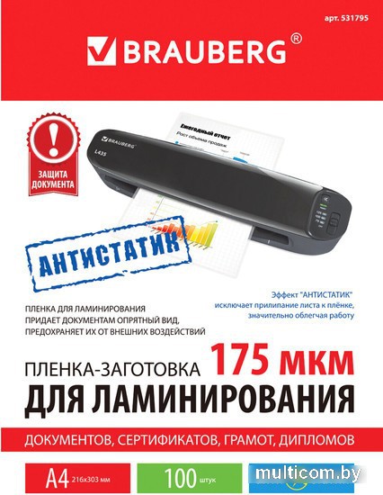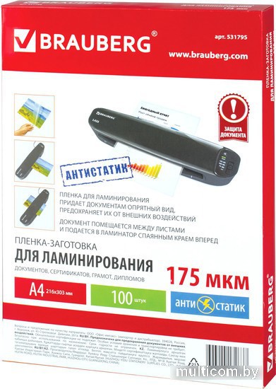 | Информация | Пленка для ламинирования BRAUBERG надежно защитит документы от влаги, пыли, воздействия УФ-лучей и других внешних факторов. Представляет собой двойной пакет, спаянный с одной стороны (содержание полиэстера 50%). Документ вкладывается между слоями пленки и в дальнейшем подвергается термообработке в ламинаторе. Суммарная толщина пленки-заготовки — 350 (175х2) мкм, что позволяет защитить документы и увеличить жесткость, сохраняя яркость изображения. Обработаны специальным составом для того, чтобы бумага, при вкладывании в пакет для ламинирования, не прилипала к пленке из-за действия статического электричества. Пленка для ламинирования BRAUBERG формата A4 (216х303 мм) имеет уникальный состав: полиэтилентерефталат (PET), этиленвинилацетат (EVA), полиэтилен (LDPE). Промежуточный слой полиэтилена (LDPE) выступает как связующий элемент между слоями PET и EVA, служит дополнительной защитой от вероятного вытекания клея из-под пленки при ламинировании. Полиэтилен (PE) придает пакетам прочность эластичность и износостойкость. Глянцевое покрытие пленки способствует сохранению и максимальной передаче цвета ламинируемого изображения. Поставляется в картонной упаковке по 100 штук, которых при нечастом использовании хватает на продолжительное время. |