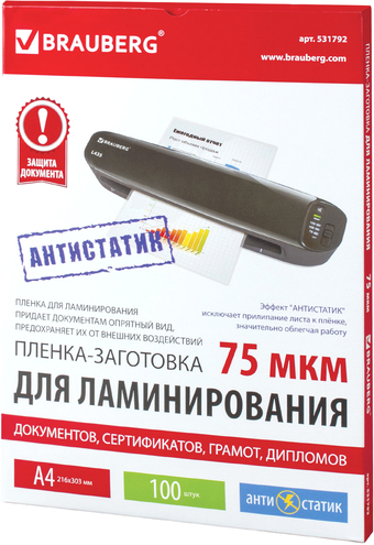 | Информация | Пленка для ламинирования BRAUBERG надежно защитит документы от влаги, пыли, воздействия УФ-лучей и других внешних факторов. Представляет собой двойной пакет, спаянный с одной стороны (содержание полиэстера > 50%). Документ вкладывается между слоями пленки и в дальнейшем подвергается термообработке в ламинаторе. Суммарная толщина пленки-заготовки — 150 (75х2) мкм, что позволяет защитить документы и увеличить жесткость, сохраняя яркость изображения. Обработаны специальным составом для того, чтобы бумага, при вкладывании в пакет для ламинирования, не прилипала к пленке из-за действия статического электричества. Пленка для ламинирования BRAUBERG формата А4 (216х303 мм) имеет уникальный состав: полиэтилентерефталат (PET), этиленвинилацетат (EVA), полиэтилен (LDPE). Промежуточный слой полиэтилена (LDPE) выступает как связующий элемент между слоями PET и EVA, служит дополнительной защитой от вероятного вытекания клея из-под пленки при ламинировании. Полиэтилен (PE) придает пакетам прочность эластичность и износостойкость. Глянцевое покрытие пленки способствует сохранению и максимальной передаче цвета ламинируемого изображения. Поставляется в картонной упаковке по 100 штук, которых при нечастом использовании хватает на продолжительное время. |