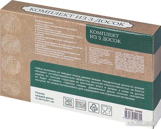 | Информация | ? Комплект из 3-х досок для разделки и сервировки ? Доски изготовлены из прочного и красивого дерева акации ? Экологически чистые материалы для безопасной работы с пищей ? Удобный помощник в резке различных продуктов ? Можно использовать для сервировки стола дома и на природе ? Подходит для подачи разнообразной еды на пикнике ? Можно использовать как подставку для декоративных композиций на кухне ?? Хранить вертикально и вдали от нагревательных приборов ?? Отличный подарок для любителей готовить и ценителей кухонных принадлежностей ?? Не использовать вблизи нагревательных приборов ?? Необходимо поддерживать нормальный уровень влажности ?? Не подходит для использования во время дождя или влажной погоды. |