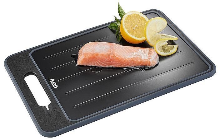 | Информация | - Инновационная доска CUT PRO от GEFU обеспечивает быструю разморозку и безопасную нарезку продуктов. - Благодаря высокой теплопроводности материала доски, замороженные продукты оттаивают до 60% быстрее, сохраняя пользу и витамины. - Подходит для разморозки мяса, рыбы, морепродуктов, ягод, грибов. - Режущая сторона из прочного пластика обладает устойчивостью к скольжению и гарантирует безопасную нарезку. - Уникальная алюминиевая поверхность обладает высокой теплопроводностью, гигиенична, не меняет вкусовых свойств продукта и не впитывает посторонние запахи. - Режущая сторона с выемкой для сбора жидкости по всему периметру доски. - Мини-терка для измельчения имбиря, чеснока или лимонной цедры на режущей поверхности. - Встроенная точилка для ножей в рукоятке доски. - Нескользящая пластиковая окантовка. - ВНИМАНИЕ: размораживающая сторона не подходит для нарезки! |