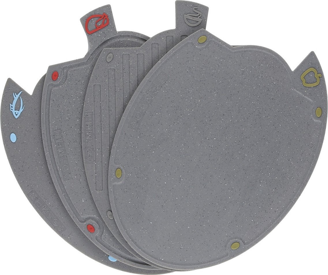 | Информация | - Набор досок на подставке с ярлычками для разных продуктов. - Доска для рыбы с мягкими зубчиками, чтобы продукт не скользил. - Доска для мяса с фиксирующими зубчиками посередине. - Доска для фруктов и овощей с гладкой поверхностью. - Доска для продуктов, прошедших термообработку, с желобками для стока жидкости. - Силиконовые синие упоры против скольжения на каждой доске. |