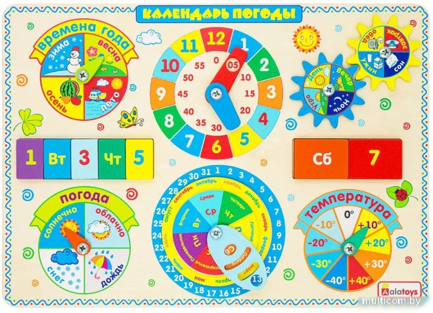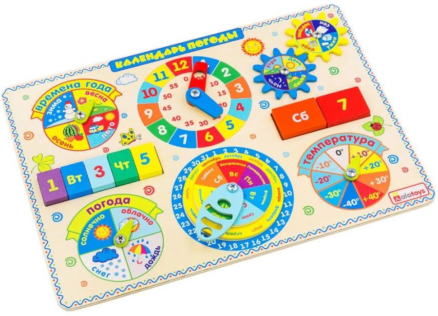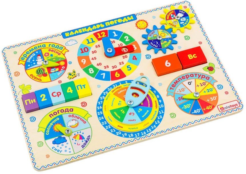 | Информация | - Календарь погоды от Alatoys - полезная игрушка для развития детей. - Детский календарь поможет родителям и детям организовать диалог предстоящих событий, задавать уточняющие вопросы и создавать правила, которые помогут нормализовать поведение ребенка. - Перед каждым новым событием можно подходить к календарю и проговаривать то, что уже сделано и что еще предстоит сделать. Календарь помогает обеспечить наглядность и сделать слова и действия взрослых понятными для ребенка. - С помощью календаря легче регулировать режимные моменты, а еще ребенок научится ориентироваться в таких понятиях, как сейчас, сегодня, потом, завтра, вчера. - Ребенок сможет как самостоятельно, так и с помощью взрослых, погрузиться в серьезный мир подсчетов и описания погодных условий, запомнит и поймет принцип работы часовой и минутной стрелок. - Игрушка понравится и малышам, и детям постарше, поскольку развивает навыки речи, пространственное мышление, логику и творчество. |