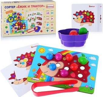 | Информация | Сортер «Ежик и трактор» — это уникальная игра с сортировкой разноцветных шариков по заданиям из карточек. Родители могут помогать ребенку обучаться пользоваться пинцетом и расставлять шарики как показано на карточках. Кроме этого можно утроить соревнование между ежиком и трактором, кто быстрее соберет шарики по выданному заданию. |