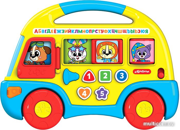 | Информация | Веселые песенки и первые знания – в большом музыкальном автобусе! Выбирайте один из двух режимов – обучающий или музыкальный. Нажимая на фигурные кнопочки, ребенок будет учить цифры, формы и цвета, послушает обучающие песенки (про алфавит, счет, формы и цвета, животных фермы, леса и зоопарка), детские хиты («Игрушки», «Догони», «Что такое праздник?», «Весёлые путешественники», «Чунга-чанга», «Пусть бегут неуклюже», «Весёлый автобус»), танцевальные мелодии («Антошка», «Песенка про кузнечика» и др.) и веселые звуки. Автобус можно катать – колесики у него крутятся, а еще у него открывается дверь, двигается окошко, крутится окошко-барабанчик и светится фара! Пассажиры веселого автобуса – это новые герои Фантики. Это дружная компания из шести зверят: Львенок Лева, Заюшка Зайка, Щенок Тима, Слоник Слоняша, Обезьянка Ириска и Котенок Сплюшик. Отправляйтесь в путешествие вместе с Фантиками! |