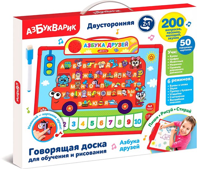 | Информация | Интерактивная двусторонняя говорящая доска – для веселого современного обучения! Первая сторона – «Нажимай и учись». Все картинки – говорящие! Нажимай – слушай и учи буквы и цифры, знакомься с животными, машинками, правилами дорожного движения. Чтобы учиться было интереснее, послушай обучающие песенки, веселые мелодии со звуками машинок и 5 детских хитов («Фантики», «Зверюшки», «Догони», «Барбарики», «Как чудесно жить на свете»). Если ты уже все выучил, проверить знания помогут умные игры: «Прятки с буквами», «Угадайка» и «Считалочка». А в игре «Волшебное пианино» ты сможешь сам сыграть 10 популярных мелодий, как настоящий музыкант! Вторая сторона – «Пиши, рисуй, стирай». Здесь есть где разгуляться детской фантазии! Рисуй любыми цветными фломастерами, пиши цифры и буквы, а потом стирай и рисуй снова (в комплект входит фломастер со специальным ластиком в колпачке). |