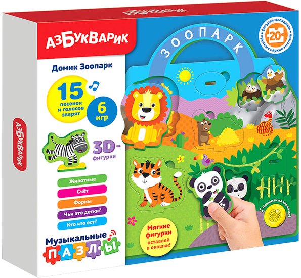 | Информация | «Домик Зоопарк» – это обучающий пазл-вкладыш для дошкольников в виде стильного портфельчика. Он изготовлен из легкого мягкого материала EVA, с которым удобно и приятно играть. Вставляя мягкие фигурки в нужные окошки, малыш познакомится со зверюшками зоопарка, выучит цифры и формы. Родители могут поиграть вместе с ребенком в обучающие игры: «Считалочка», «Загадки про животных», «Логическая цепочка из фигурок» и др. Такие занятия развивают память, логическое мышление, мелкую моторику. Фигурки животных можно поставить на подставки – и разыграть настоящее театральное представление. Играть под музыку еще интереснее! При нажатии на кнопочку малыш послушает веселые песенки с голосами зверят: «Счёт в зоопарке», «Злой зелёный крокодил», «Слон», «Обезьяна», «Попугай такой красивый!», «Панда». |