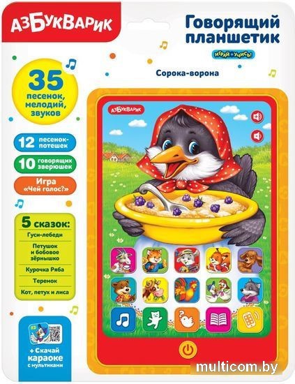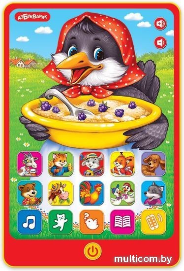 | Информация | В этом говорящем планшетике с яркой привлекательной картинкой собрано 5 сказок ("Гуси-лебеди", "Петушок и бобовое зернышко", "Курочка Ряба", "Кот, петух и лиса", "Теремок") и 12 весёлых потешек ("Ладушки", "Идёт коза рогатая", "Пошёл котик на торжок", "Заинька, попляши!", "Мишка косолапый", "Петушок" и другие). Нажимай, слушай, подпевай любимым героям! Угадывай голоса зверюшек! Громкость звука регулируется. |