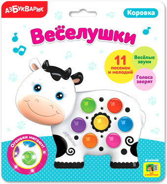 | Информация | Музыкальная игрушка Коровка из серии "Веселушки" подарит вашему малышу много веселья, порадует разноцветными мигающими огоньками и будет способствовать его гармоничному развитию. Нажимая на кнопочки, малыш сможет послушать добрые песенки и мелодии ("Раным-рано поутру", "Коровка", "На весёлой ферме", "Идёт коза рогатая", "Сорока-белобока", "33 коровы" / "Частушки", "Песенка о лете", "Кто пасётся на лугу?", "Песенка фермера", "Тень-тень, потетень"), весёлые звуки и даже голоса зверят! |