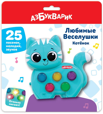 | Информация | Музыкальный котенок из серии «Любимые Веселушки» мило улыбается и замечательно поет! Нажимая на разноцветные кнопочки, малыш послушает веселые песенки и мелодии («Я малыш, котёнок славный», «Стало солнышко теплей», «Друзья», «Сколько пальчиков на ручке?», «Весёлая карусель» и др.), а также множество забавных звуков и голосов зверят. Всего в игрушке 25 песенок, мелодий, звуков. Во время звучания песенок на кнопочках мигают огоньки! |