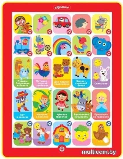| Информация | С новым говорящим и музыкальным планшетиком скучать не придётся! Ведь в нём есть и любимые народные сказки («Пузырь, Соломинка и Лапоть», «Петушок – золотой гребешок», «Два жадных медвежонка», «Бычок – смоляной бочок», «Солнышко»), и сказки известных писателей («Кот в сапогах», «Мальчик с пальчик», «Красная Шапочка», «Бременские музыканты», «Принцесса на горошине»), и весёлые детские хиты («Барбарики», «Мамочка», «Бибика», «Бум-Бум», «Чуку-чу» и др.), и даже сказки-песенки («Три медведя», «Колобок», «Теремок», «Репка», «Курочка Ряба»). Всего в планшетике 25 песенок, сказок, стихов, а также множество веселых звуков и голосов зверят. Все картинки звучат! |