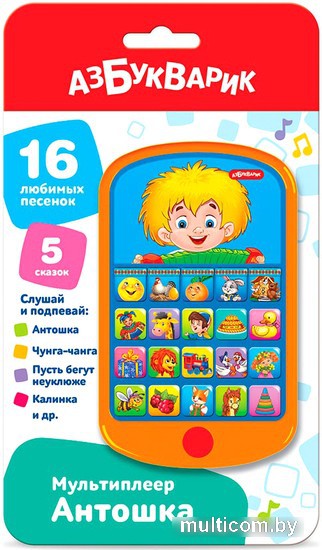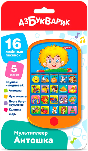 | Информация | Весёлый Антошка приглашает малышей петь и танцевать! Нажимая на яркие кнопки этого модного смартфончика, ребенок сможет послушать 16 детских хитов («Пляшут весело детишки», «Чунга-чанга», «Моя семья», «Каравай», «Танец маленьких утят», «Пусть бегут неуклюже», «Песня Львёнка и Черепахи», «Чуку-чу», «Два веселых гуся» и др.) и 5 сказок («Колобок», «Курочка Ряба», «Репка», «Заюшкина избушка», «Теремок»). |