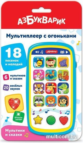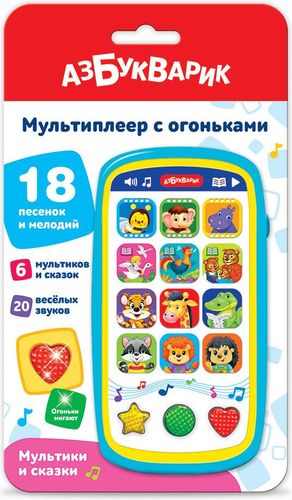 | Информация | В мультиплеере с огоньками «Мультики и сказки» собрано 6 мультсказок («Пчелка и цветок», «Мама для Мамонтенка», «Как Бегемотик стал чистюлей», «Гуси-лебеди», «Петушок и бобовое зернышко», «Три медведя»), 18 песенок и мелодий из мультиков («Наш тигренок — лучший друг», «Чунга-чанга», «Песенка про дружбу», «Пусть бегут неуклюже», «Жил да был веселый ежик», «Облака», «Антошка» и др.). Нажимая на яркие кнопочки, малыш сможет спеть с любимыми героями, а также потанцевать под диско-мелодии. Разноцветные огоньки на фигурных кнопочках мигают под музыку! ? Мультиплеер с огоньками «Мультики и сказки» порадует своим ярким дизайном: он похож на настоящий «взрослый» смартфон. С такой игрушкой малыш будет занят надолго! Игра с таким мультиплеером не только развлекает малыша, но и развивает у него музыкальные способности, память, воображение. |