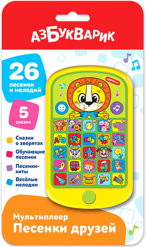 | Информация | Веселый львенок приглашает малышей петь, танцевать и веселиться! Нажимая на яркие кнопки этого модного смартфончика, дети смогут послушать 13 песенок-хитов («Львёнок Лёва», «Разные друзья бывают», «Что вы знаете про льва?», «Барбарики», «Весёлая карусель» и др.), 5 обучающих песенок, 5 сказок о зверятах («Мартышкин день рождения», «Два щенка», «Солнышко», «Три поросёнка», «Как Бегемотик стал чистюлей»), танцевальные мелодии и забавные звуки. |