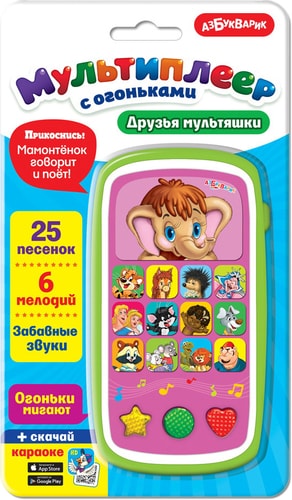 | Информация | Более 30 весёлых песенок и мелодий – в новом мультиплеере («Песенка Мамонтёнка», «Частушки Бабок-Ёжек», «Какой чудесный день!», «Чунга-чанга»). Пой с Мамонтёнком и другими мультяшками, танцуй под любимые хиты – развивай свои таланты. Разноцветные огоньки на фигурных кнопочках мигают под музыку! |