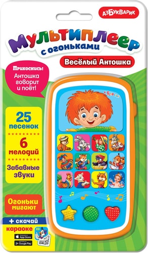 | Информация | Более 30 весёлых потешек и мелодий – в новом мультиплеере («Мишка косолапый», «Заинька, попляши!», «Каравай», «Два весёлых гуся» и др.). Пой с Антошкой, танцуй под любимые хиты – развивай свои таланты. Разноцветные огоньки на фигурных кнопочках мигают под музыку! |