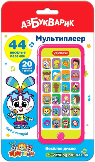 | Информация | Мультиплеер «Весёлое диско» выглядит как настоящий взрослый смартфон! В нем собрано 44 популярные детские песенки («Котёнок-веселушка», «Если весело живётся, делай так», «Динозавры бывают разные», «Барбарики», «Стало солнышко теплей», «Бибика», «Догони»), 20 мелодий и крутых рингтонов. Нажимай на кнопочки с яркими картинками – слушай и подпевай! А еще знакомься с новыми героями – Фантиками! Львенок Лева, Заюшка Зайка, Щенок Тима, Котенок Сплюшик, Слоник Слоняшка и Обезьянка Ириска споют песенки про себя и подарят отличное настроение. |