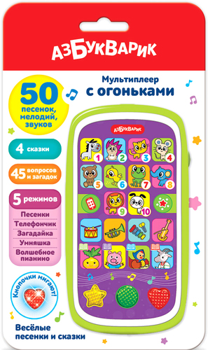 | Информация | Ваш малыш любит песенки, сказки и веселые игры? Тогда этот мультиплеер с огоньками – для него. В нем собрано 4 сказки («Репка», «Три поросёнка», «Курочка Ряба», «Волк и семеро козлят»), 50 песенок, мелодий и звуков («Ждёт лошадка малышей», «Жил да был весёлый ёжик», «Котёнок-веселушка», «Мышка-малышка», «Бурый мишка», «Озорной цыплёнок», «Что на завтрак у лягушки?», «Моет слон живот и уши», «Грозный лев», «Забавный щенок», «Лесная считалочка», «Формы всякие вокруг», «Весёлые противоположности» и др.), 45 вопросов и загадок. Малыш может выбрать один из пяти режимов игры: «Песенки», «Телефончик», «Загадайка», «Умняшка», «Волшебное пианино». С такой многофункциональной игрушкой ребенок будет занят надолго! А разноцветные огоньки на фигурных кнопочках поднимут настроение. Детский мультиплеер положительно влияет на общее развитие ребёнка, а также стимулирует развитие речи, делая её богатой и правильной благодаря многократному прослушиванию сказок. При этом слушая песенки, ребёнок научится петь. Игры с мультиплеером «Весёлые песенки и сказки» в несколько раз повысят музыкальные способности вашего ребенка. |