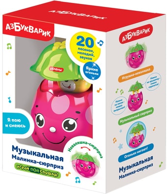 | Информация | Игрушка-сюрприз порадует любого ребенка, особенно если этот сюрприз – музыкальный! Кто же прячется в большой малинке? Нажми скорее на носик-кнопочку! Ух ты – это мишка! Продолжай нажимать на кнопочку – мишка споет 10 песенок и мелодий («Друзья», «Песенка про счёт», «Весёлые противоположности», «Пляшут весело детишки», «Бум Бум», «Весёлая карусель», «Песенка про кузнечика» и др.). Чтобы мишка обратно спрятался в домик-малинку, нужно нажать на крышечку. А еще с малинкой можно играть как с неваляшкой – раскачивать ее в разные стороны! |