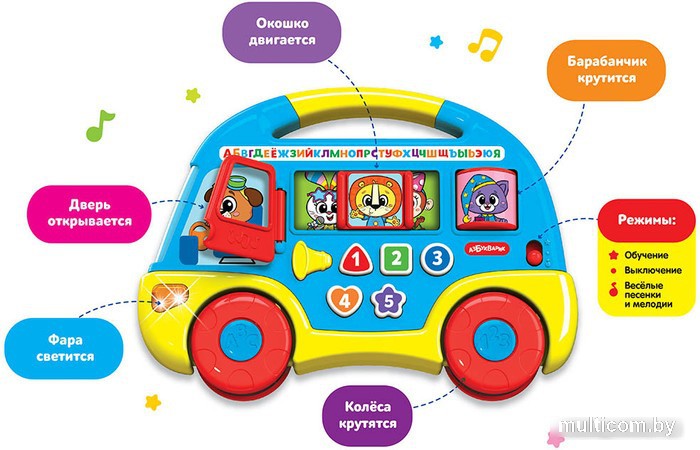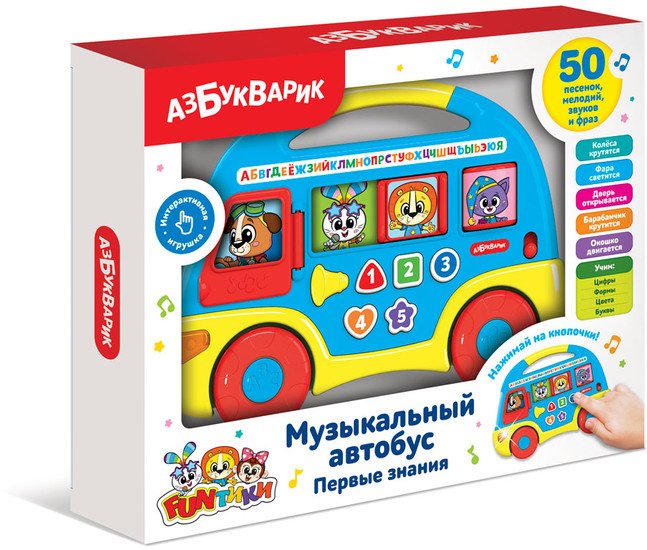 | Информация | ? В большом музыкальном автобусе Азбукварик Музыкальный автобус. Первые знания / 2808 (синий) веселые песенки и первые знания! Выберите один из двух режимов — обучающий или музыкальный. Нажимая на фигурные кнопочки, ребенок будет учить цифры, формы и цвета, послушает обучающие песенки, детские хиты, танцевальные мелодии и веселые звуки. Автобус можно катать — колесики у него крутятся, а еще у него открывается дверь, двигается окошко, крутится окошко-барабанчик и светится фара! Пассажиры веселого автобуса — это новые герои Фантики. Это дружная компания из шести зверят: Львенок Лева, Заюшка Зайка, Щенок Тима, Слоник Слоняша, Обезьянка Ириска и Котенок Сплюшик. Отправляйтесь в путешествие вместе с Фантиками! ??Батарейки в комплект не входят. |