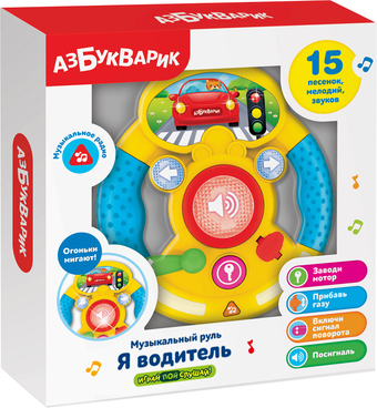 | Информация | Яркий музыкальный руль для маленьких водителей! Подвижные элементы, настоящие звуки машины, яркие огоньки поворотников, большая светящаяся кнопка сигнала, радио с любимыми песенками и мелодиями – всё это сделает игру интересной и увлекательной! |