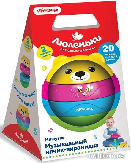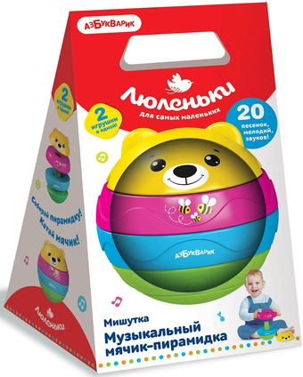 | Информация | Оригинальная развивающая игрушка для малышей – мячик-пирамидка! Это две игрушки в одной! Ребенок сможет собрать мячик-пирамидку из больших колечек, подбирая их по форме и цвету. Такое занятие прекрасно развивает логику и мелкую моторику. Все колечки – музыкальные: собирая их, ребенок будет слушать забавные звуки, веселые потешки и мелодии («Мишка косолапый», «Ножки, ножки, где вы были?», «Тень-тень, потетень», «Чижик-пыжик», «Каравай» и др.). Собрали мячик – теперь можно его покатать, побегать за ним и повеселиться! Малыши будут в восторге! |